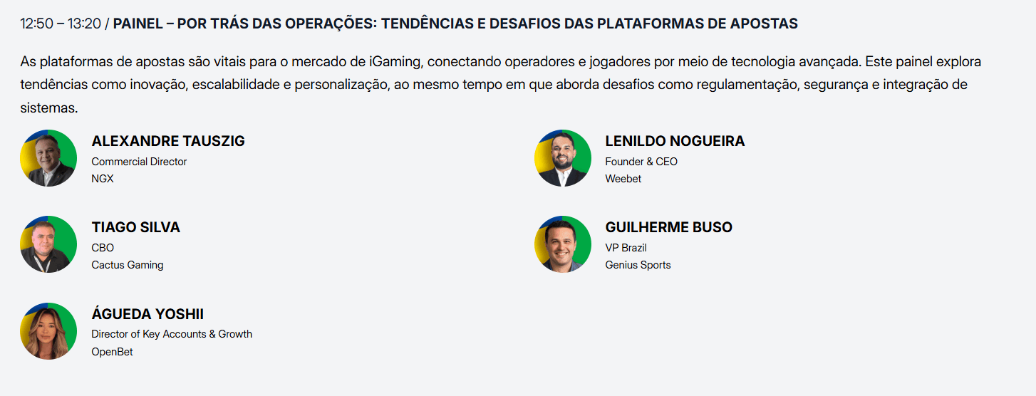 O painel está agendado para o dia 9 de abril, das 12h50 às 13h20, no Palco Jardins, e reunirá grandes nomes do mercado para discutir as tendências e desafios enfrentados pelas plataformas de apostas. Alexandre Tauszig dividirá o palco com Guilherme Buso, VP Brazil da Genius Sports, Lenildo Nogueira, CEO e Fundador da Weebet, Tiago Silva, CBO da Cactus Gaming, e Águeda Yoshii, Diretora de Key Accounts & Growth da OpenBet.